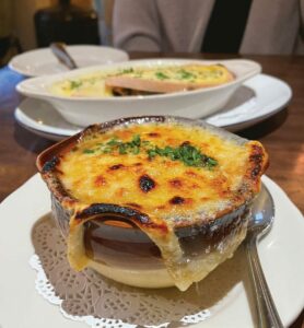 Next, I went to Compagnon Wine Bistro (335 W. 7th St.), our very own French restaurant in town. The only soup option on the menu is French onion. It’s remarkable how a humble and simplistic soup made with a combination of onion, beef broth, sherry wine, and thyme can produce such an incredibly heartwarming dish. Also, presentation-wise, it’s pretty impressive. Traditionally, this soup is served in crocks and arrives at the table piping hot, topped with melted Gruyère cheese on a thin slice or two of bread. Customarily, the size of this type of soup is small because it’s just a starter, so it’s not filling on its own. However, there are plenty of delicious choices on the menu to explore.