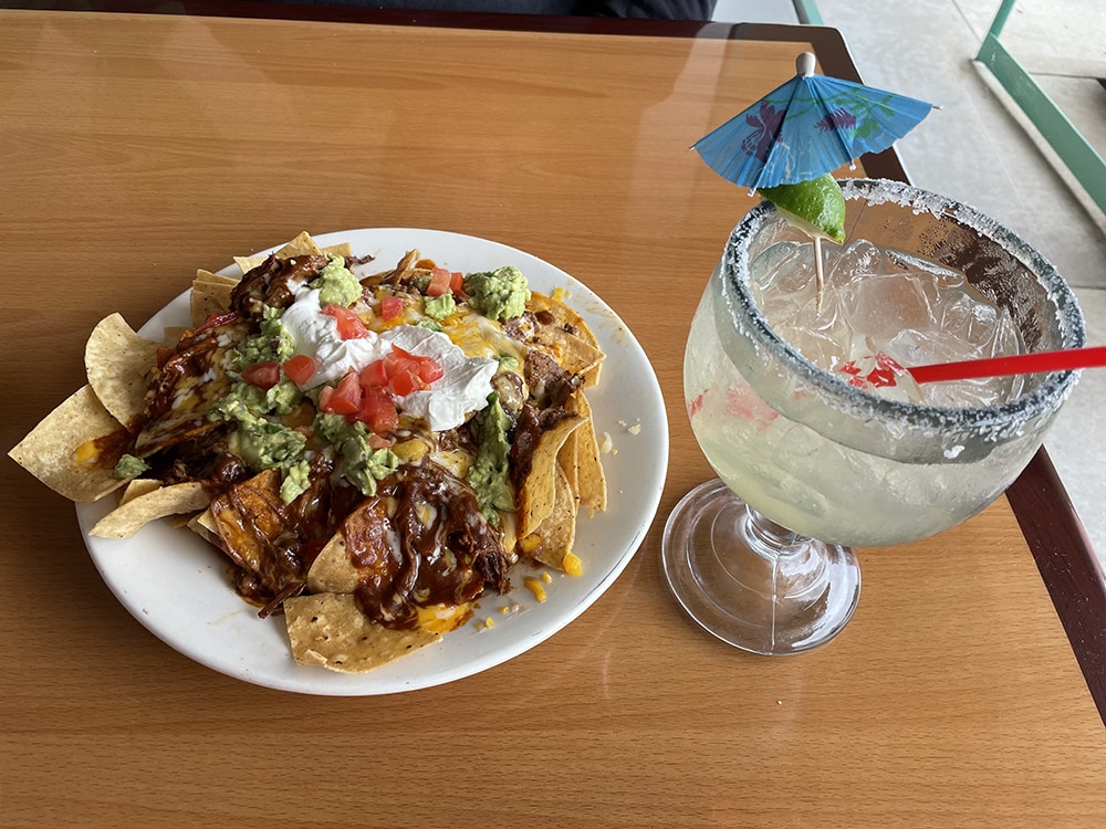 My second favorite is the nachos at Maria’s Mexican Restaurant (28643 S. Western Ave.). Maria’s Nachos Supreme is made with large corn tortillas topped with beans, shredded beef in a red sauce, cheese, guacamole, sour cream, and tomatoes. Jalapeños are also available by request; sadly, I often forget to ask for them. I particularly like the shredded beef because it elevates the taste of the nachos. Pair it with their original lime margarita with a slice of lime for a very satisfying combination. spt