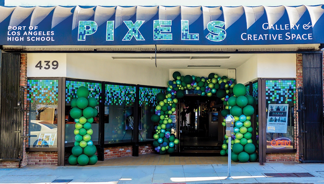 The crowd outside the newly renovated art gallery stretches into the middle of 6th Street, blocking traffic. It’s First Thursday in September, and the throng of people, a mix of teenagers, their parents, some local dignitaries, and Port of Los Angeles High School staff, are anxiously awaiting the grand opening of Pixels, a new art gallery and creative space for POLAHS students.