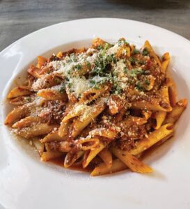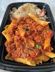 The first homemade mostaccioli dishes I tried were made by Zeb’s Kitchen’s professional chef Josetta Spychaj and Mrs. Spicy Cro. Spychaj’s recipe is passed down from her nonna, who owned the Fishermen’s Cove in Terminal Island, which many cannery workers frequented. Her recipe is made with 80/20 ground beef or brisket on special occasions. Mrs. Spicy Cro only uses ground lean top sirloin from South Shores Meat Shop. She adds butter at the end for added moisture and flavor and a good amount of parmesan cheese.