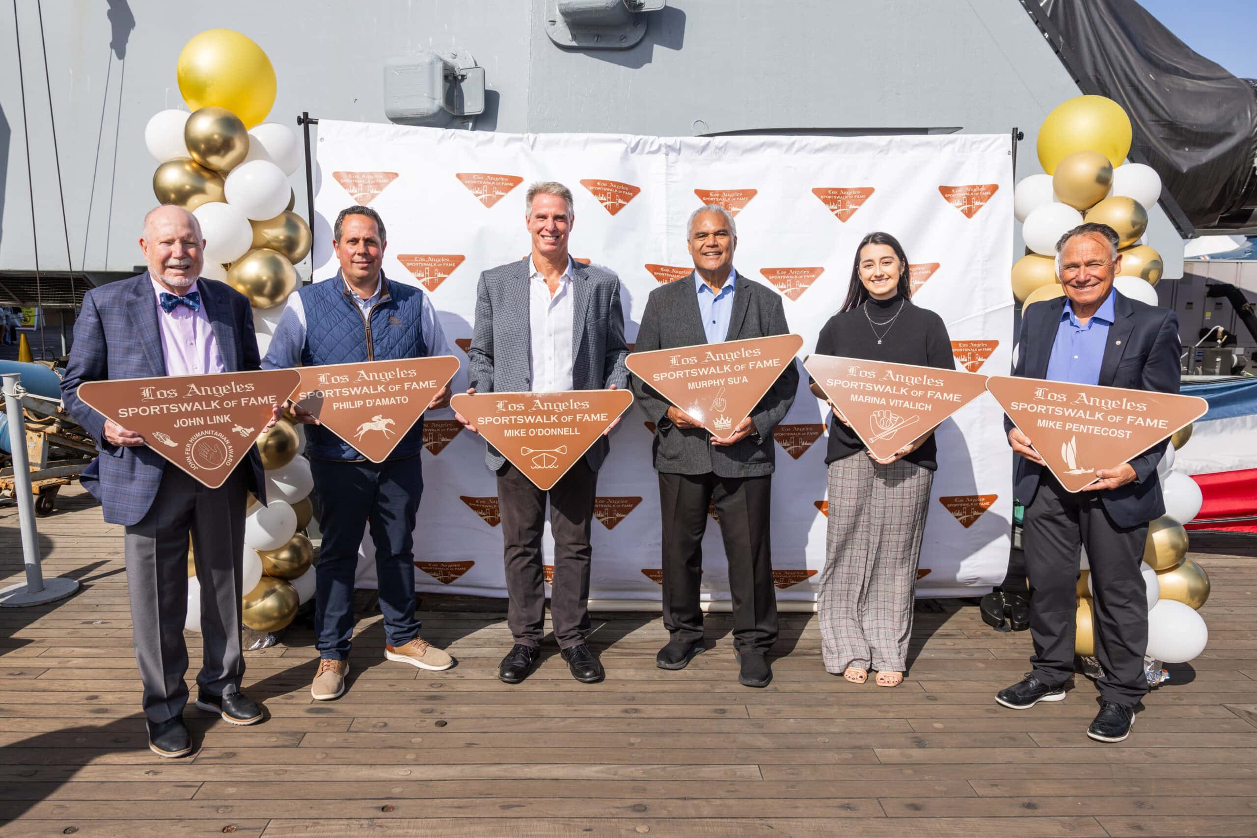 San Pedro’s Sportswalk of Fame—now the Los Angeles Sportswalk of Fame—honored six athletes aboard the Battleship Iowa Museum on Oct. 13. This year’s honorees were John Link, Philip D’Amato, Marina Vitalich, Murphy Su’a, Mike Pentecost, and Mike O’Donnell. The event raised $12,000 in scholarships for local high school athletes. Founded in 1978 to celebrate sports achievement and community spirit, the Sportswalk continues its mission to promote sports education and youth scholarships. Past honorees include icons like Jerry West, Jackie Robinson, Jackie Joyner-Kersee, and Tommy Lasorda. spt (photos: John Mattera Photography)