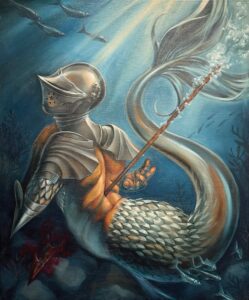 To me, armor represents the ways in which transgender people have had to protect themselves both recently and historically. The historical significance of armor alludes to the presence queer people have had throughout history, acknowledged or not. Additionally, the cold, hard metal emphasizes the warmth and delicacy of the flesh exposed by my knights. It serves as a reminder, these characters in clad armor are human, and the trans people I paint are human.